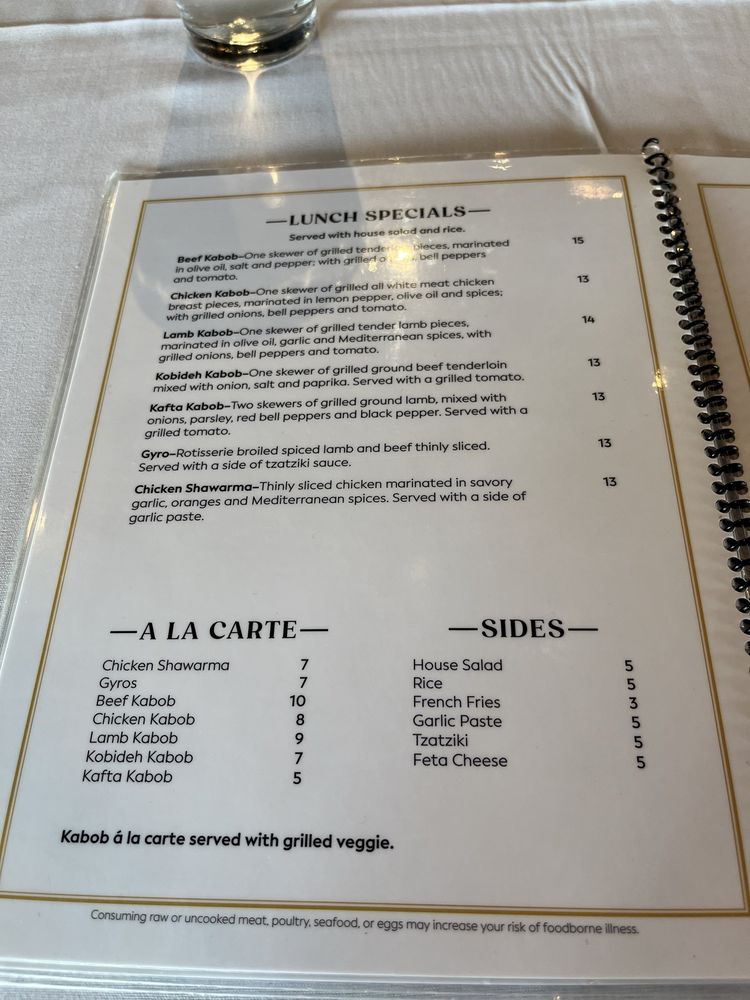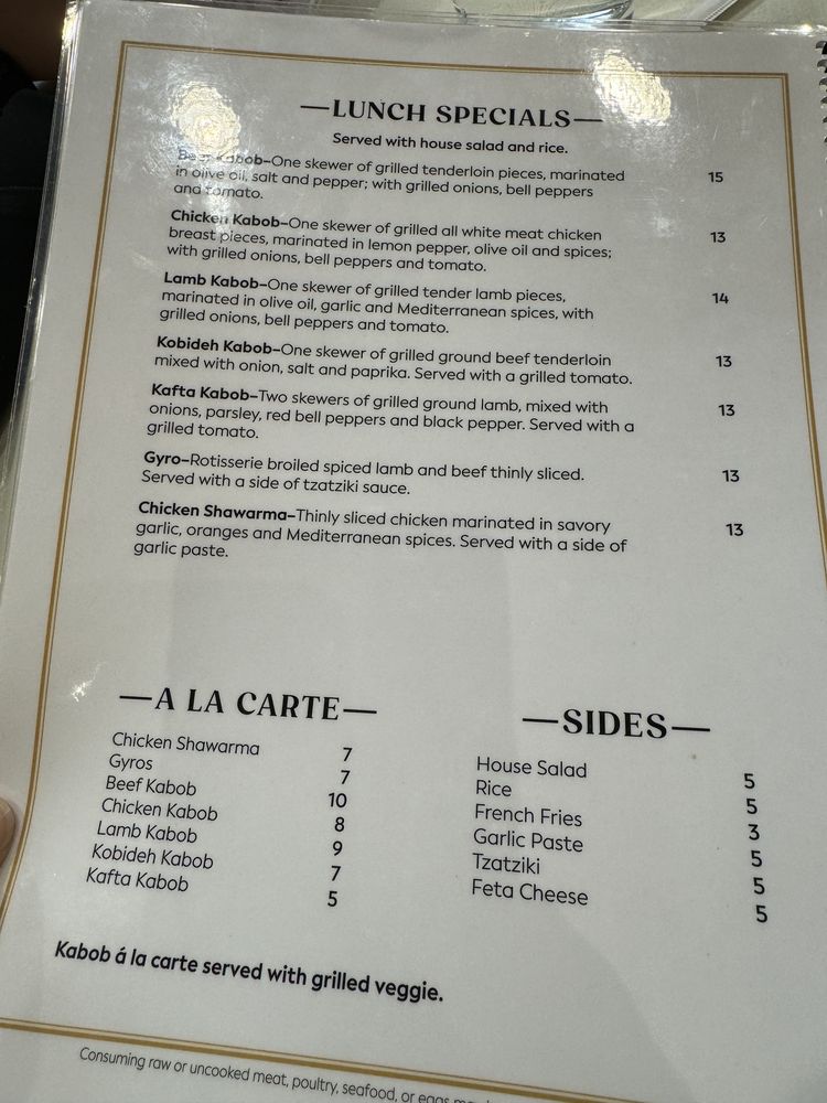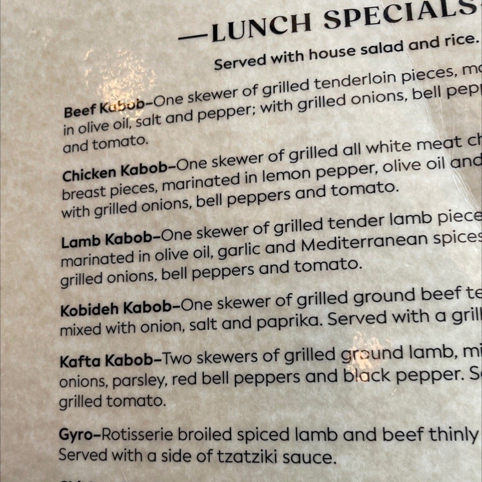 Rotisserie broiled spiced lamb and beef thinly sliced. Served with a side of tzatziki sauce